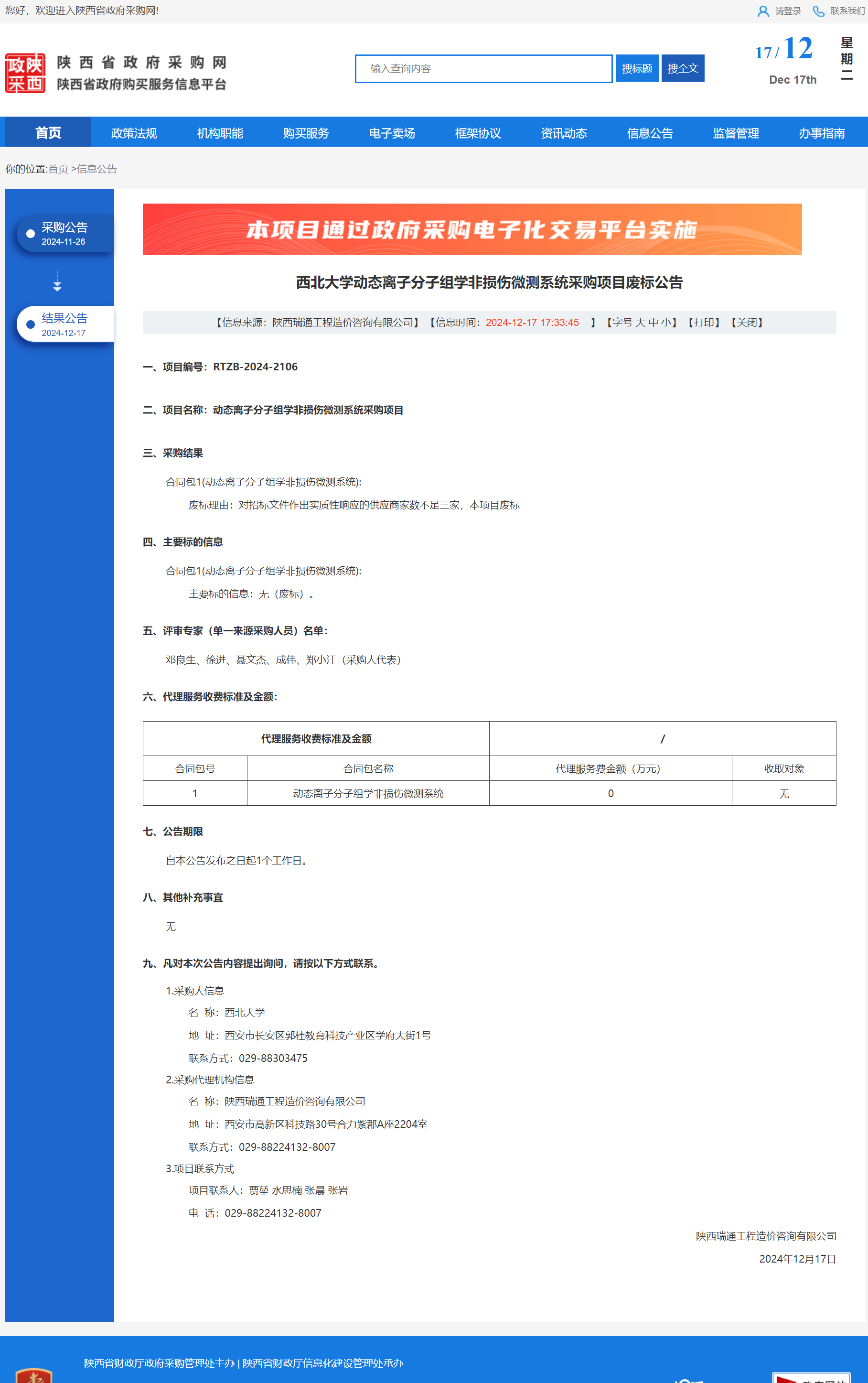 必赢3003no1线路检测中心动态离子分子组学非损伤微测系统采购项目废标公告 作者:采购与招标办公室 编辑: 时间:2024-12-17 原公告链接:http://www.ccgp-shaanxi.gov.cn/freecms/site/shaanxi/ggxx/info/2024/8a69c5a59218576d0193d3ef8a485b79.html?noticeType=001006¬iceId=a477f0fe-bc5b-11ef-8063-08c0eb20c666