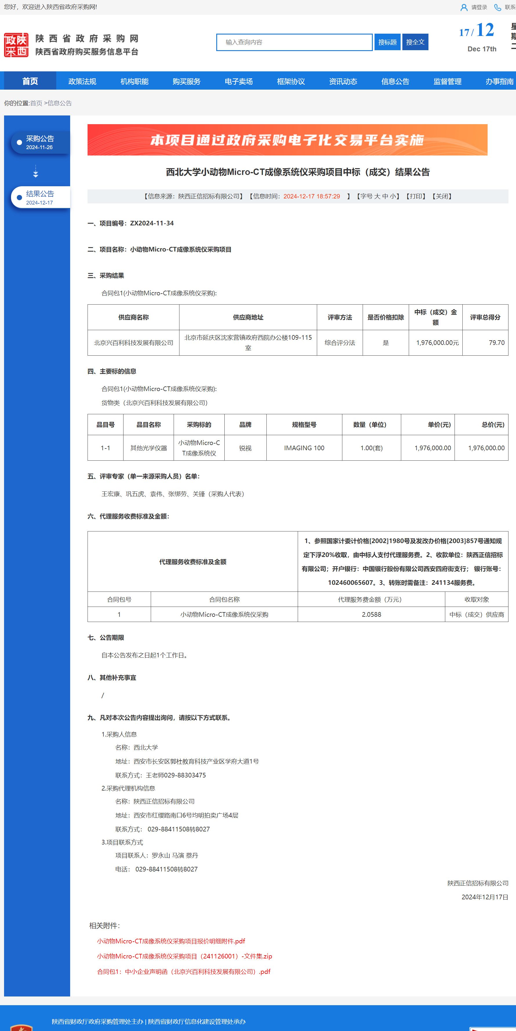 必赢3003no1线路检测中心小动物Micro-CT成像系统仪采购项目中标(成交)结果公告 作者:采购与招标办公室 编辑: 时间:2024-12-17 原公告链接:https://www.ccgp-shaanxi.gov.cn/freecms/site/shaanxi/ggxx/info/2024/8a69c44e9218572b0193d4033f7641ea.html?noticeType=001021¬iceId=56a58cac-bc67-11ef-8063-08c0eb20c666