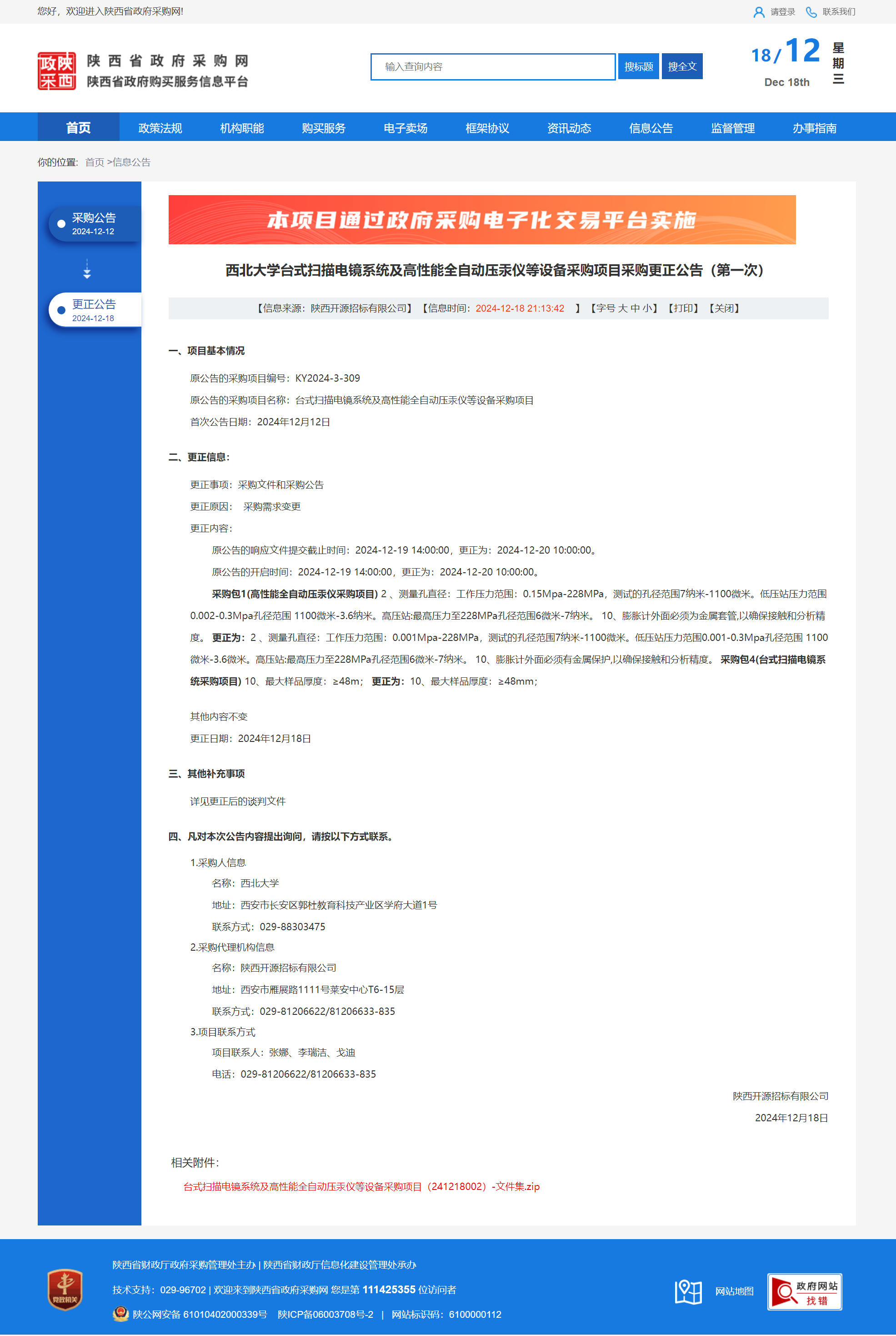 必赢3003no1线路检测中心台式扫描电镜系统及高性能全自动压汞仪等设备采购项目采购更正公告(第一次)