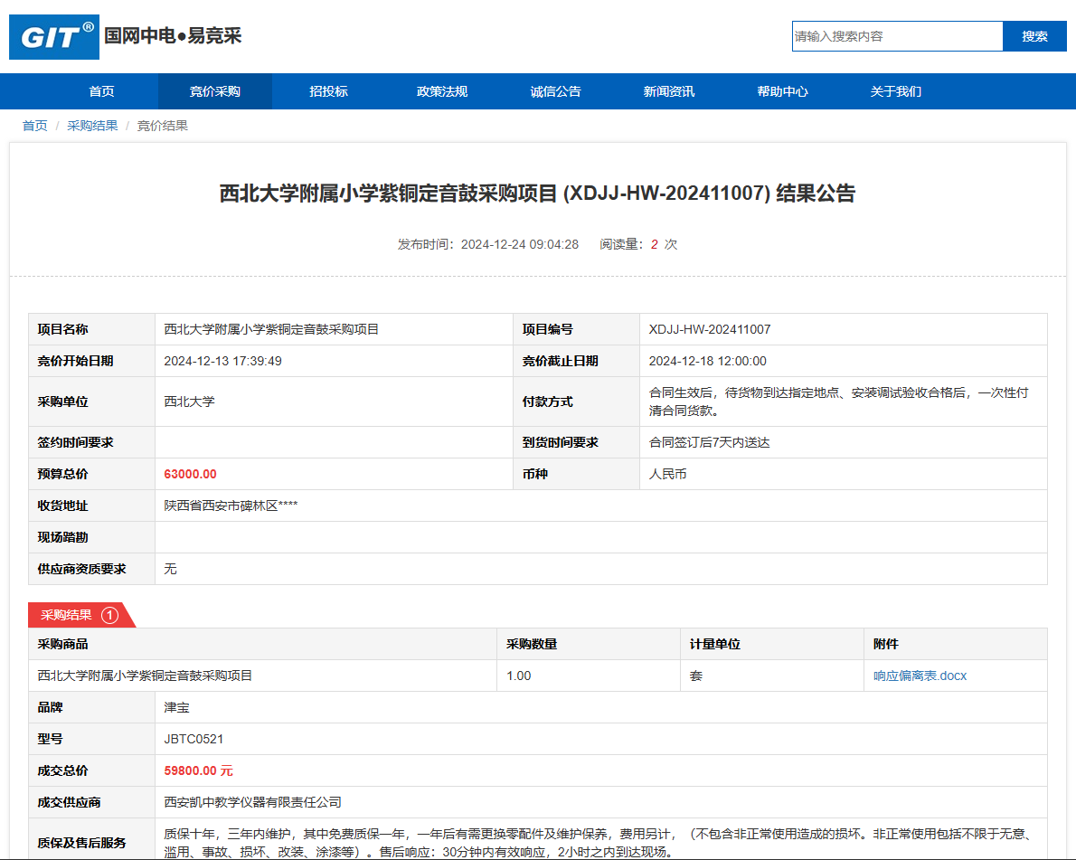 必赢3003no1线路检测中心附属小学紫铜定音鼓采购项目(XDJJ-HW-202411007)竞价结果公告 作者:采购与招标办公室 编辑: 时间:2024-12-24 原公告链接:https://www.ejingcai.com.cn/site/bidding/detail/16145