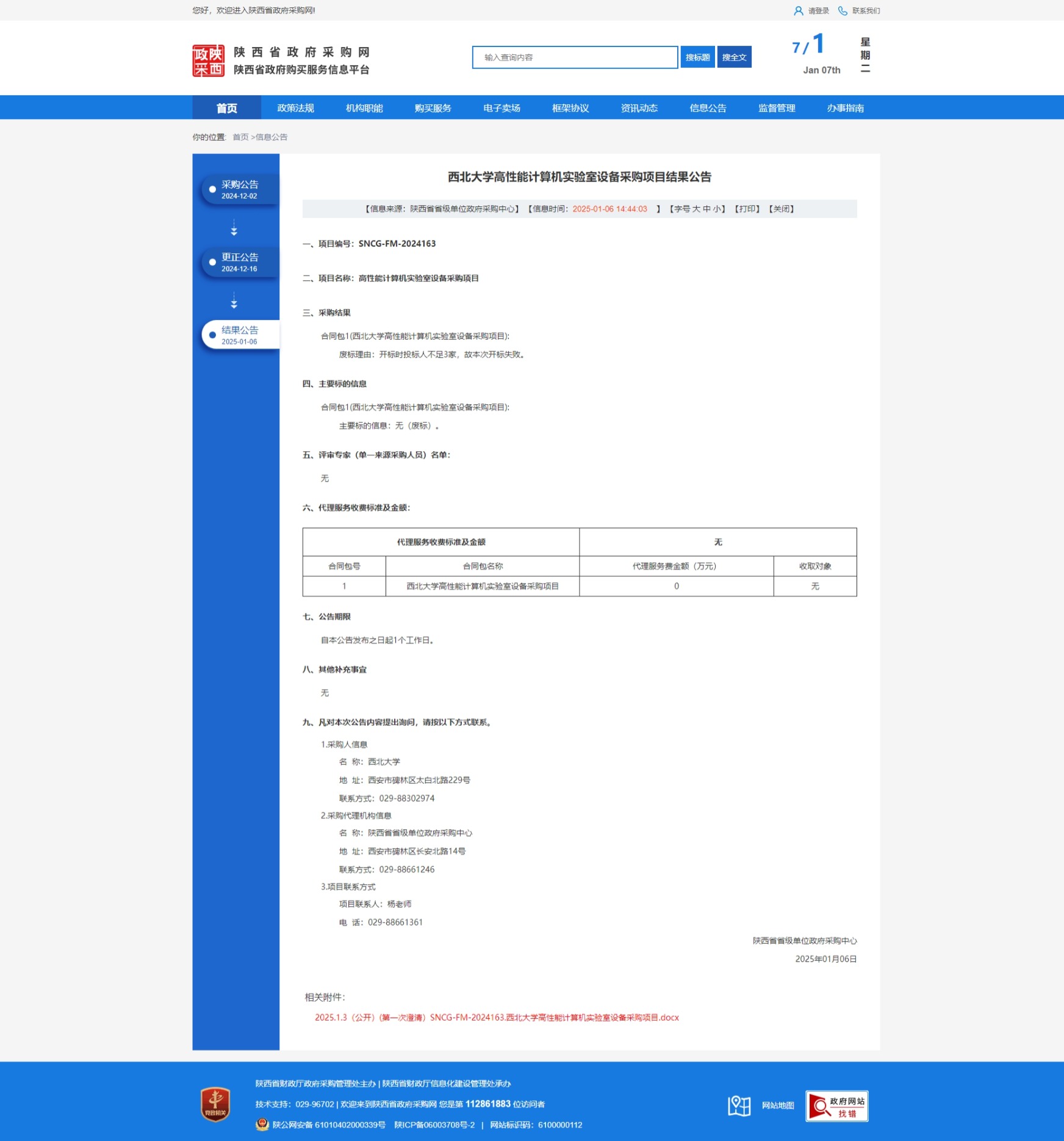 必赢3003no1线路检测中心高性能计算机实验室设备采购项目结果公告 作者: 编辑:薛利娟 时间:2025-01-07 原公告链接:https://www.ccgp-shaanxi.gov.cn/freecms/site/shaanxi/ggxx/info/2025/8a69c95d921859f001943992fed82bb1.html?noticeType=001006¬iceId=49269ef4-cbfb-11ef-8063-08c0eb20c666
