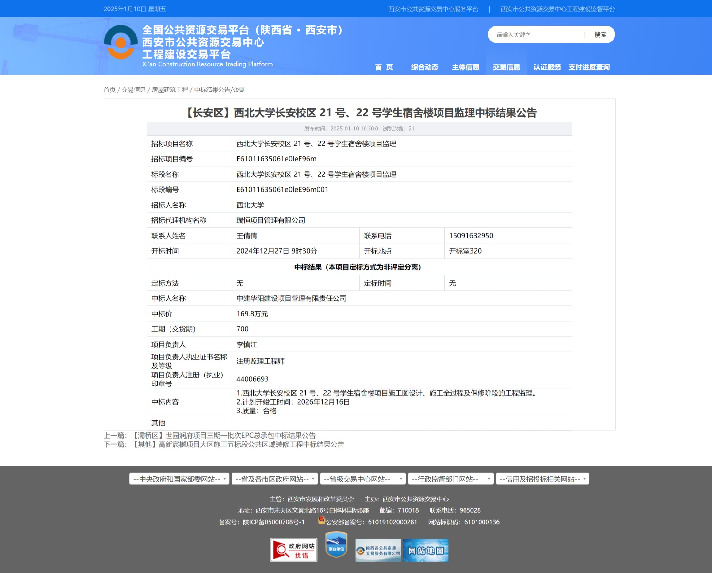 必赢3003no1线路检测中心长安校区 21 号、22 号学生宿舍楼项目监理中标结果公告