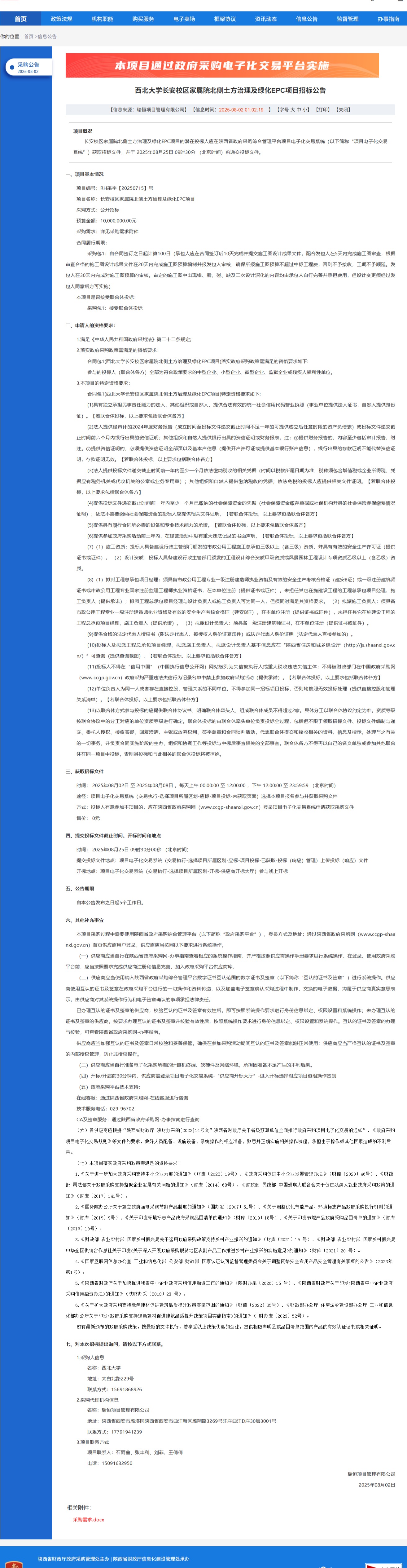 必赢3003no1线路检测中心长安校区家属院北侧土方治理及绿化EPC项目招标公告 作者: 编辑:党丹珩 时间:2025-08-02 公告地址:http://www.ccgp-shaanxi.gov.cn/freecms/site/shaanxi/ggxx/info/2025/8a69c7f19860ef060198668ebf817f37.html?noticeType=001011¬iceId=537d203b-6efb-11f0-8063-08c0eb20c666