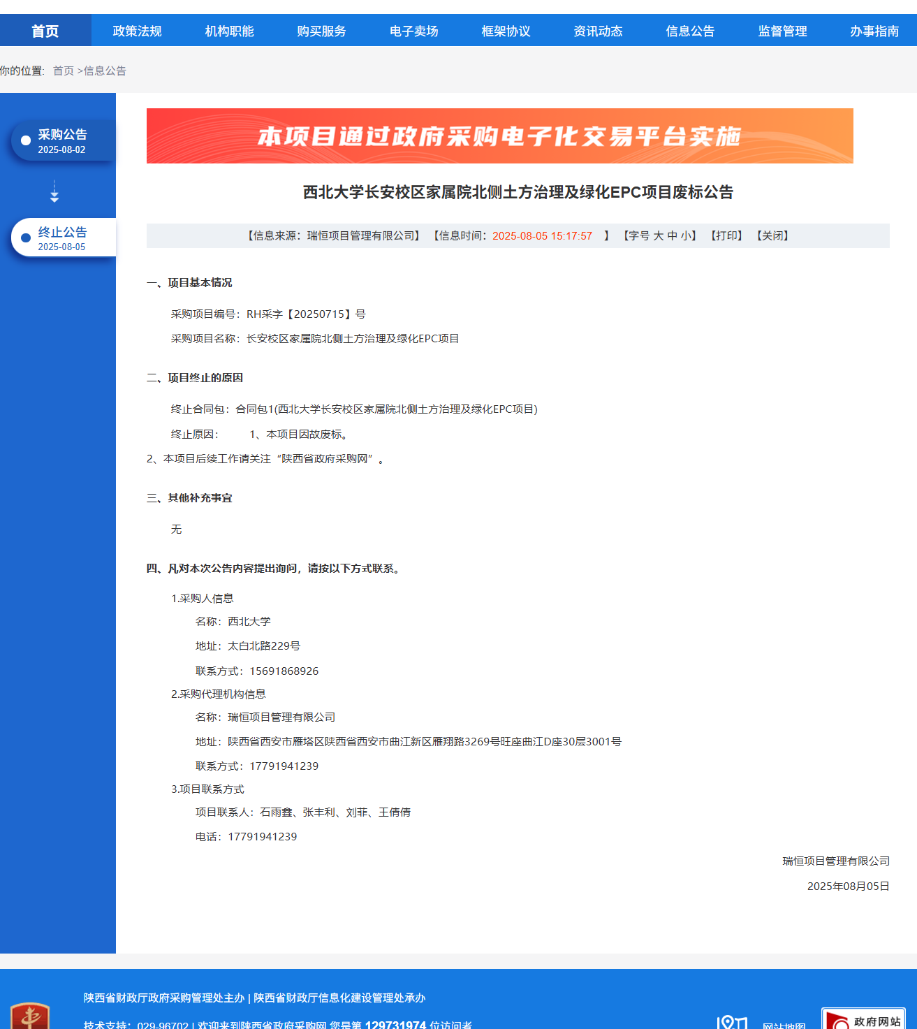 必赢3003no1线路检测中心长安校区家属院北侧土方治理及绿化EPC项目废标公告 作者: 编辑:党丹珩 时间:2025-08-05 公告地址:http://www.ccgp-shaanxi.gov.cn/freecms/site/shaanxi/ggxx/info/2025/8a69c8f99860f21c0198790d379441f5.html?noticeType=001004¬iceId=5c6803f0-71ce-11f0-8063-08c0eb20c666