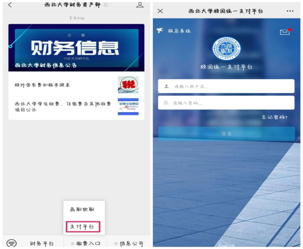 手机端:关注“必赢3003no1线路检测中心财务资产部”微信公众号,选择“缴费入口”点击“支付平台”进入。(见下图)