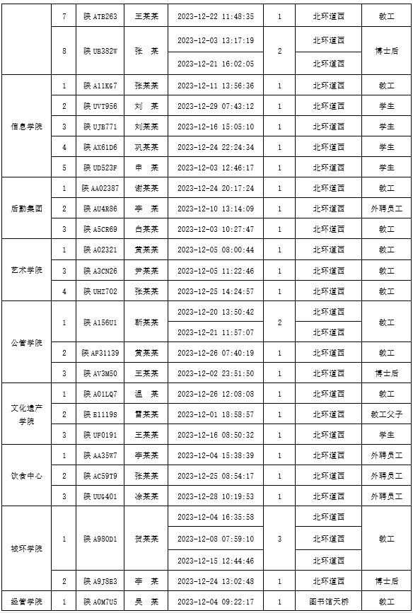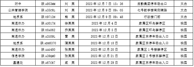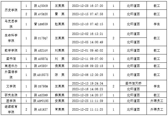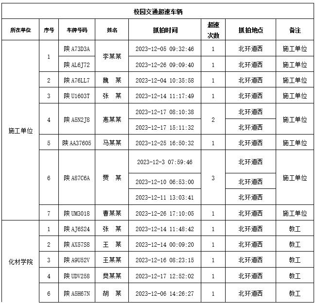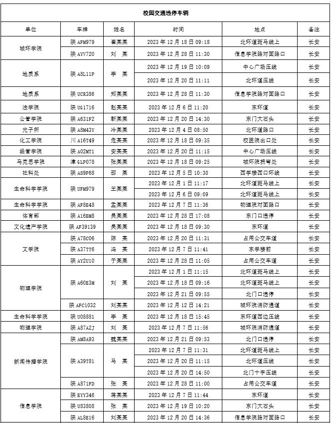为加强校内道路交通安全管理,规范校内交通秩序,根据《必赢3003no1线路检测中心校园道路交通管理办法》有关要求,现将2023年12月校园交通违章车辆予以曝光,所在单位负责对本单位违章师生员工进行交通安全教育和日常管理。