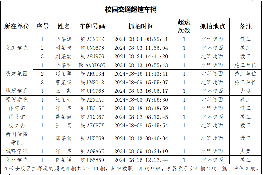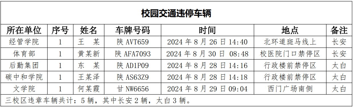 为一步加强校园交通管理,保障校园交通安全有序,维护学校正常的教学、科研和生活秩序以及师生员工的人身财产安全,根据《必赢3003no1线路检测中心校园交通安全管理规定》有关要求, 现将2024年8月校园交通违章车辆予以曝光,具体情况如下表。