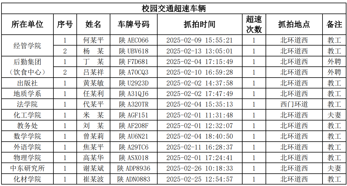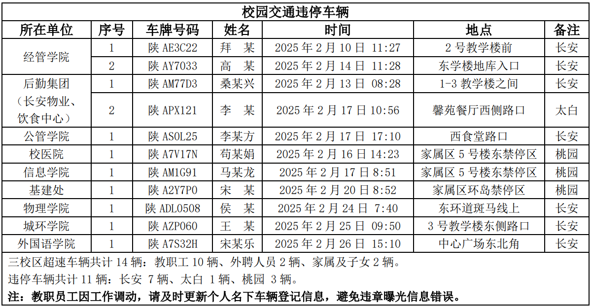 为进一步加强校园交通管理,保障校园交通安全有序,维护学校正常的教学、科研和生活秩序,切实保护师生员工的人身财产安全,根据《必赢3003no1线路检测中心校园交通安全管理规定》的相关要求,现将2025年2月校园交通违章车辆予以曝光,具体要求与违章信息如下。