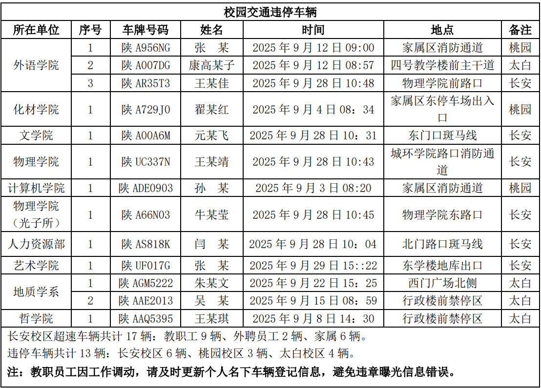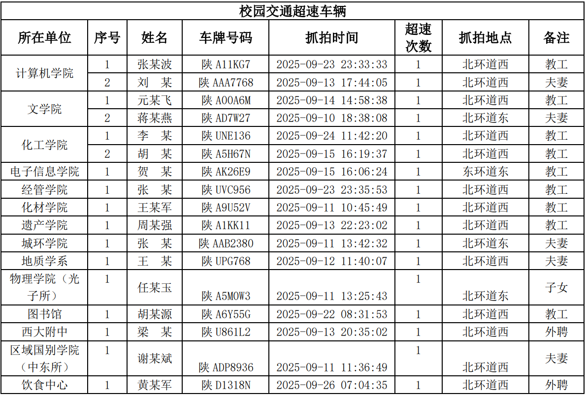 为进一步加强校园交通管理,保障校园交通安全有序,维护学校正常的教学、科研和生活秩序,切实保护师生员工的人身财产安全,根据《必赢3003no1线路检测中心校园交通安全管理规定》的相关要求,现将2025年9月校园交通违章车辆予以曝光,具体要求与违章信息如下: