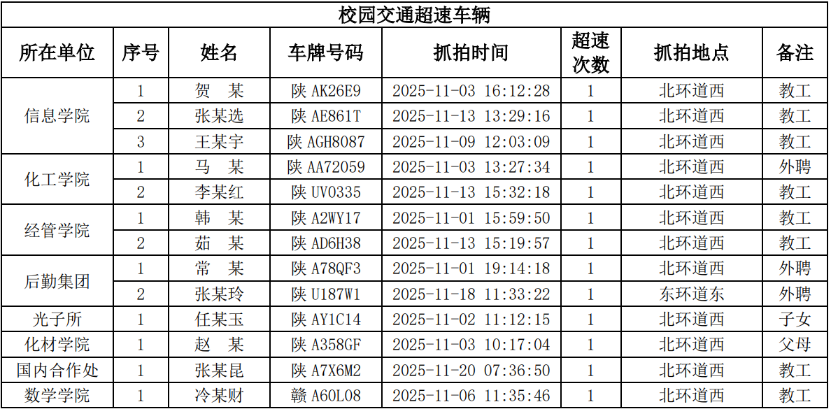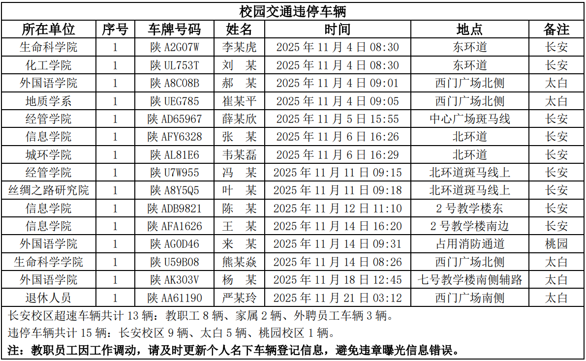 为进一步加强校园交通管理,保障校园交通安全有序,维护学校正常的教学、科研和生活秩序,切实保护师生员工的人身财产安全,根据《必赢3003no1线路检测中心校园交通安全管理规定》的相关要求,现将2025年11月校园交通违章车辆予以曝光,具体要求与违章信息如下: