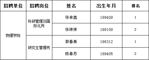物理学院公开招聘B类人事代理人员结果公示 作者: 编辑: 时间:2019-06-13 09:18 根据《必赢3003no1线路检测中心物理学院公开招聘管理人员公告》的工作安排,经自主报名、资格审核、初试和复试环节,现将拟录用人员名单公示如下:公示时间:2019年6月13日至2019年6月15日。公示期内,如有异议,请以书面形式向必赢3003no1线路检测中心物理学院反映。联系电话:88303384。物理学院2019年6月13日