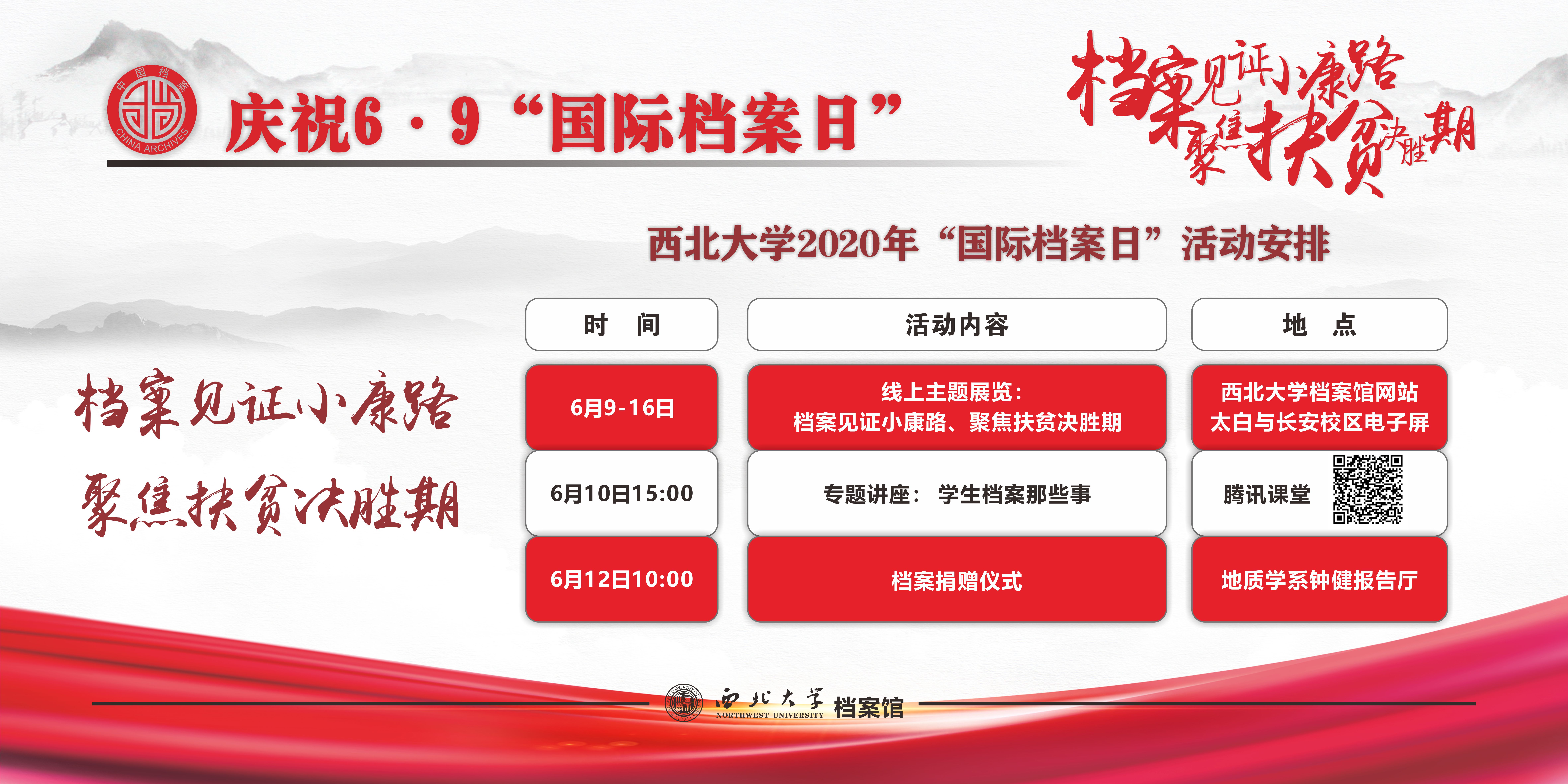 为深入学习宣传贯彻习近平总书记来陕考察重要讲话,认真贯彻落实《关于加强和改进新形势下档案工作的意见》和《国家档案局关于开展2020年国际档案日系列宣传活动的通知》等有关精神,发挥档案工作“记载历史、传承文明、服务未来”的作用和档案“存凭、留史、资政、育人”的功能,讲好“必赢故事”,增强全校师生档案意识,进一步推动学校档案工作,助力“双一流”建设,学校举办第六届以“档案见证小康路、聚焦扶贫决胜期”为主题的“国际档案日”系列活动。具体活动安排如下,欢迎广大师生参加!