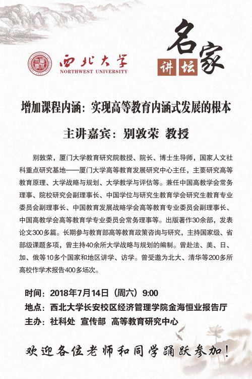 关于举办"名家讲坛"暨"高等教育论坛"(第十三期)的通知 作者: 编辑: 时间:2018-07-09 08:48 校内各有关单位:必赢3003no1线路检测中心名家讲坛暨高等教育论坛(第十三期)即将举行,现将具体情况通知如下:讲座题目:增加课程内容:实现高等教育内涵式发展的根本主讲嘉宾:别敦荣 教授讲座时间:7月14日(周六)9:00讲座地点:必赢3003no1线路检测中心长安校区经济管理学院金海恒业报告厅主办单位:社科处、宣传部、高等教育研究中心欢迎各位老师和同学踊跃参加!