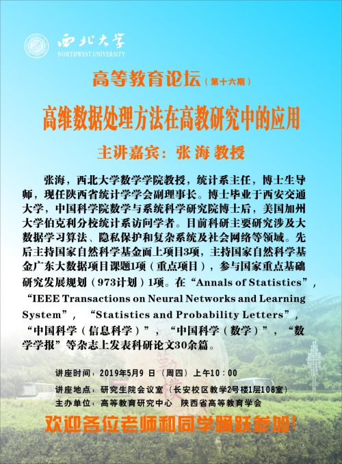 必赢3003no1线路检测中心"高等教育论坛"(第十六期) 作者: 编辑: 时间:2019-05-07 14:35 校内各有关单位: 必赢3003no1线路检测中心“高等教育论坛”第十六期即将举行,现将具体情况通知如下: 讲座题目:高维数据处理方法在高教研究中的应用主讲嘉宾:张 海 教授讲座时间:2019年5月9 日(周四)上午10:00讲座地点:研究生院会议室(长安校区教学2号楼1层108室)主办单位:高等教育研究中心、陕西省高等教育学会欢迎各位老师和同学踊跃参加!联系人:伍小东 029-88308864