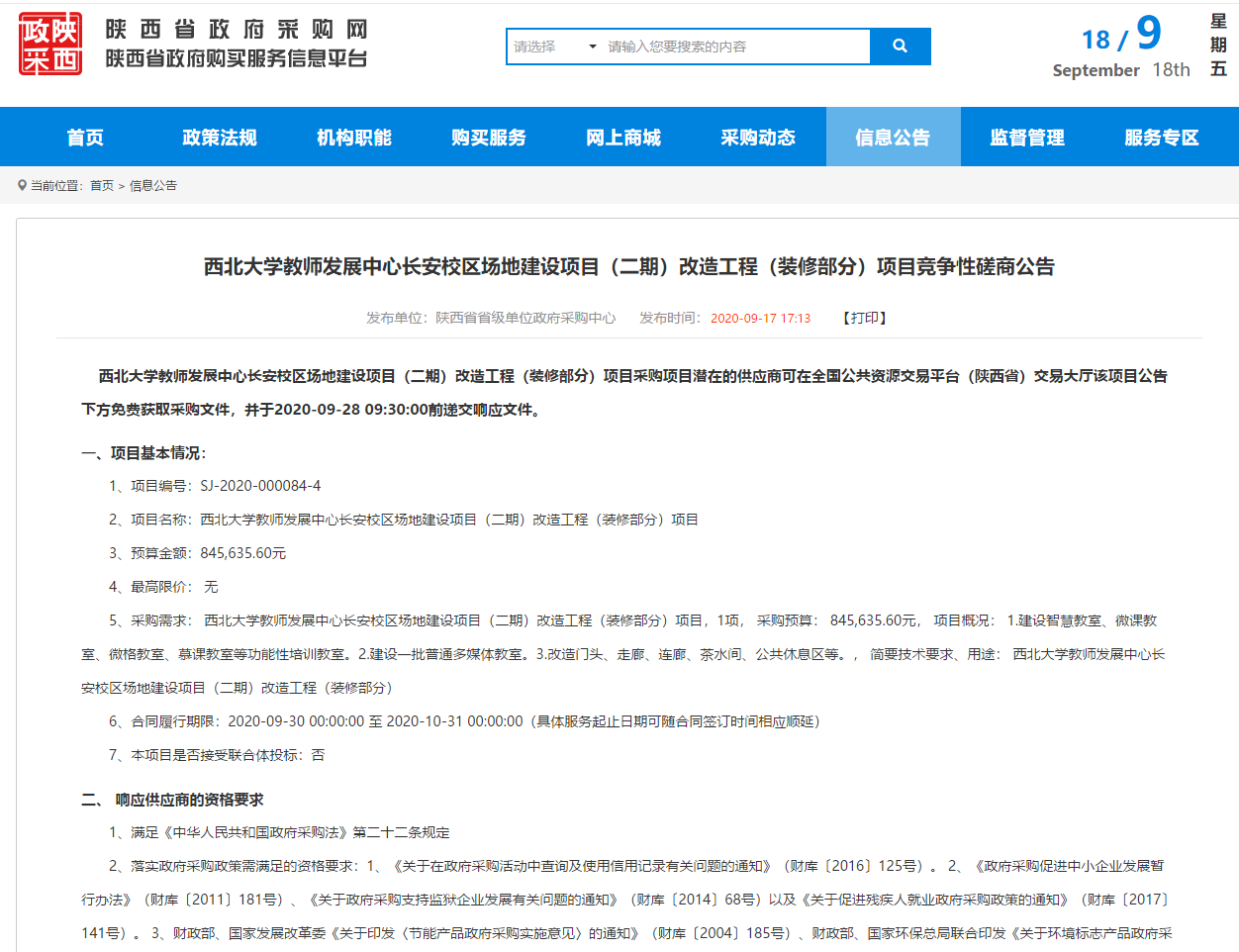 必赢3003no1线路检测中心教师发展中心长安校区场地建设项目(二期)改造工程(装修部分)项目竞争性磋商公告 作者: 编辑:季兴帅 时间:2020-09-18 公告原文链接:http://www.ccgp-shaanxi.gov.cn/notice/noticeDetail.do?noticeguid=8a85be327394d739017499e718111004