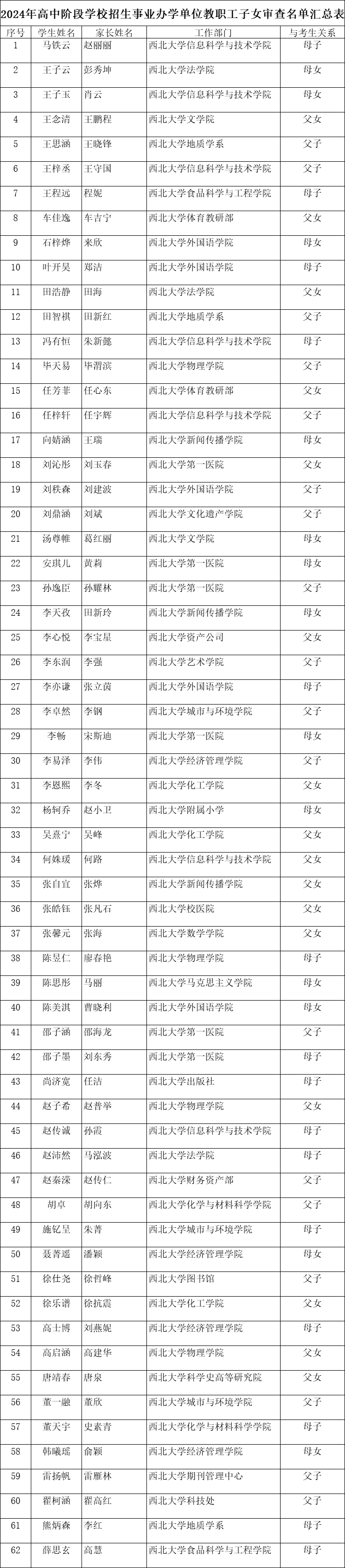 关于2024年高中阶段学校招生必赢3003no1线路检测中心 正式事业编制的教职工直系初中应届毕业子女审查结果的公示 作者:附中 编辑:附中 时间:2024-05-13 根据市、区教育局通知及要求,必赢于2024年5月6日开展2024年高中阶段学校招生必赢3003no1线路检测中心正式事业编制的教职工直系初中应届毕业子女审查工作。经大学人力资源部门、纪检部门审核,通过名单如下(按学生姓氏笔画数排序): 现予以公示,公示时间为5月13日至5月19日。公示期内,如对公示名单有异议,可通过来电形式向必赢反映。 电 话:88363909 必赢3003no1线路检测中心附属中学 2024年5月13日