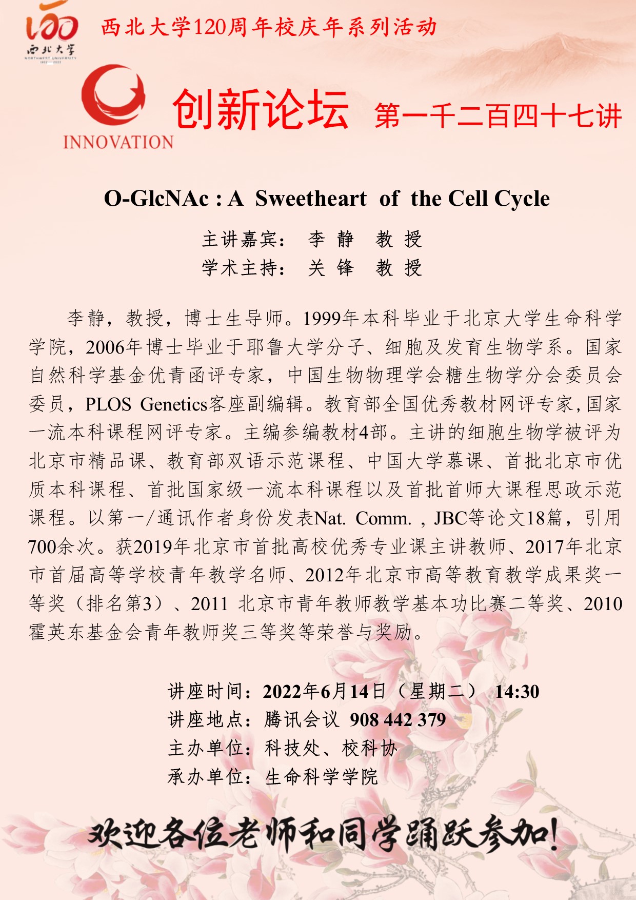必赢3003no1线路检测中心创新论坛第一千二百四十七讲暨120周年校庆年系列活动:O-GlcNAc : A Sweetheart of the Cell Cycle 作者:李 静 教 授 编辑: 时间:2022-06-13