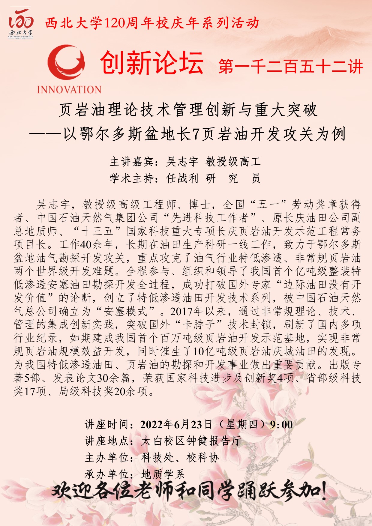必赢3003no1线路检测中心创新论坛第一千二百五十二讲暨120周年校庆年系列活动:页岩油理论技术管理创新与重大突破——以鄂尔多斯盆地长7页岩油开发攻关为例 作者:吴志宇 教授级高工 编辑: 时间:2022-06-21