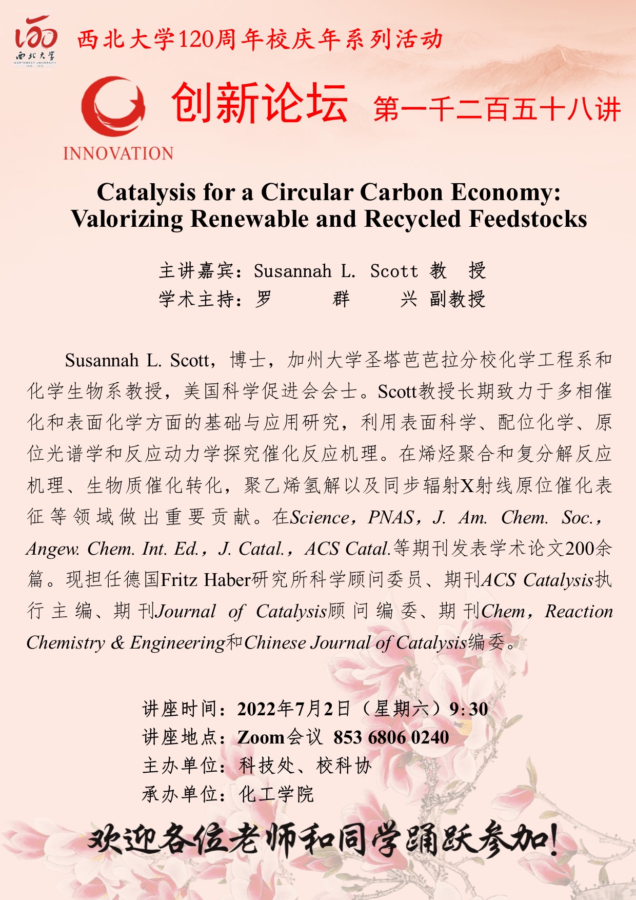 必赢3003no1线路检测中心创新论坛第一千二百五十八讲暨120周年校庆年系列活动:Catalysis for a Circular Carbon Economy: Valorizing Renewable and Recycled Feedstocks 作者:Susannah L. Scott 教授 编辑: 时间:2022-06-30