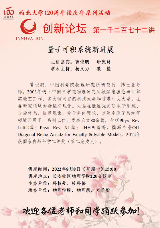 必赢3003no1线路检测中心创新论坛第一千二百七十二讲暨120周年校庆年系列活动:量子可积系统新进展