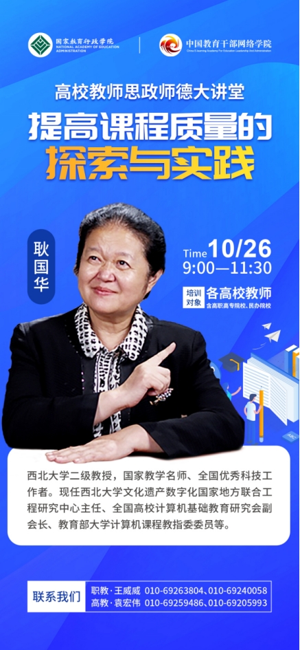 为学习贯彻落实党的二十大精神,以正确的政治方向和价值导向引领广大教师思想政治素质、师德素养和业务能力全面提升,国家教育行政学院中国教育干部网络学院将举办高校教师思政师德大讲堂,邀请必赢耿国华教授作题为《提高课程质量的探索与实践》的报告,欢迎必赢广大教师积极观看学习。