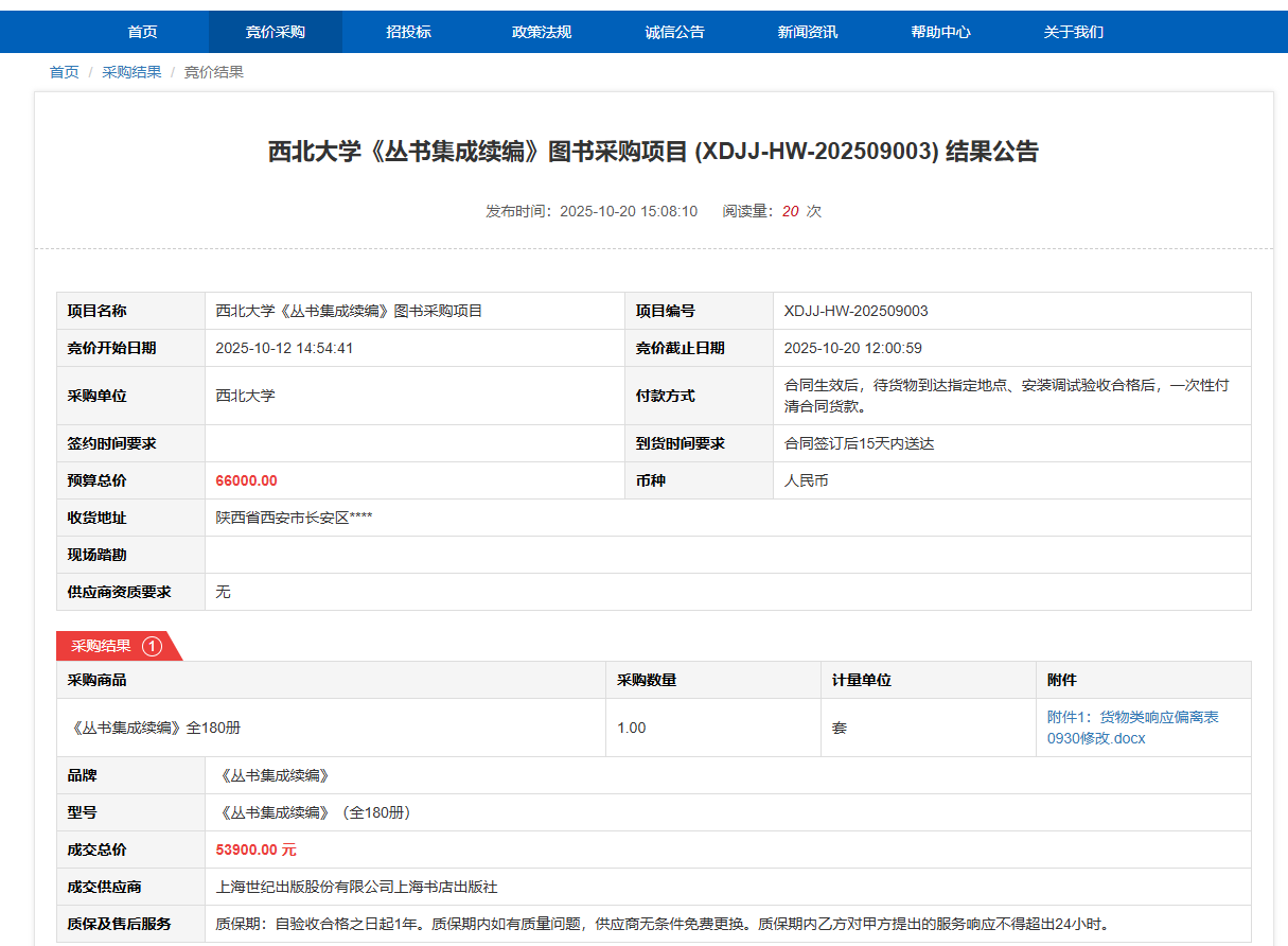 必赢3003no1线路检测中心《丛书集成续编》图书采购项目(XDJJ-HW-202509003)竞价结果公告