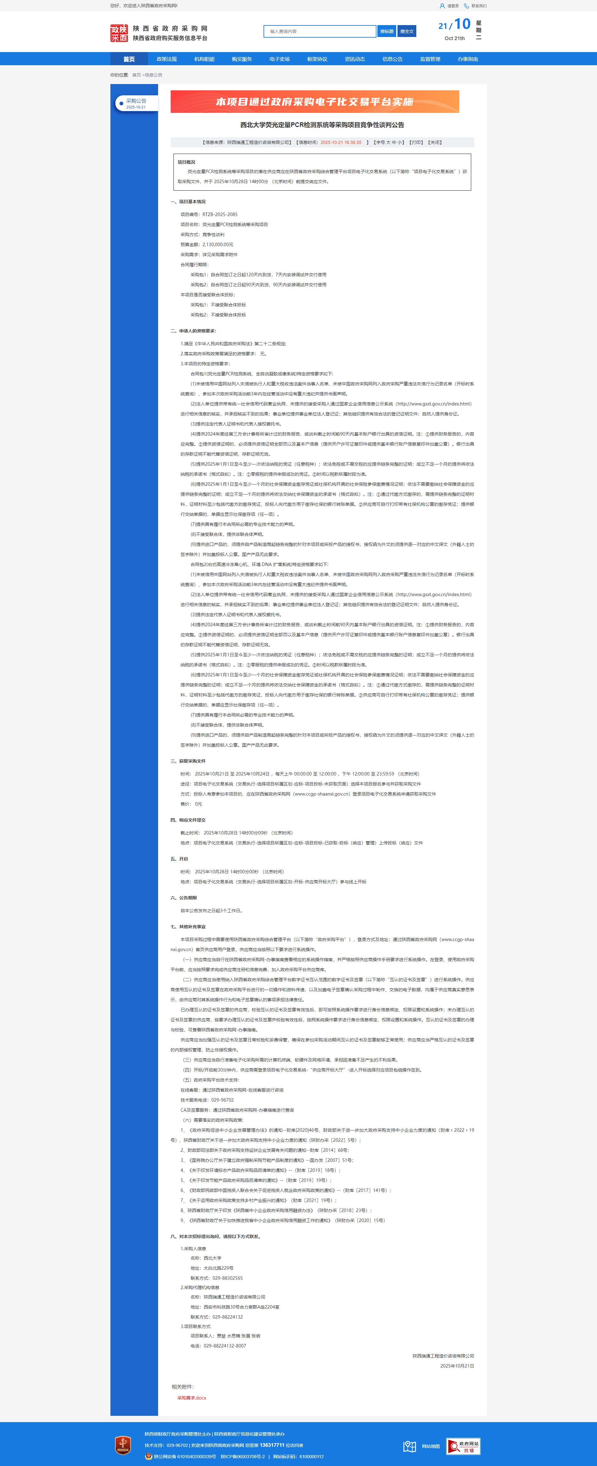 必赢3003no1线路检测中心荧光定量PCR检测系统等采购项目竞争性谈判公告