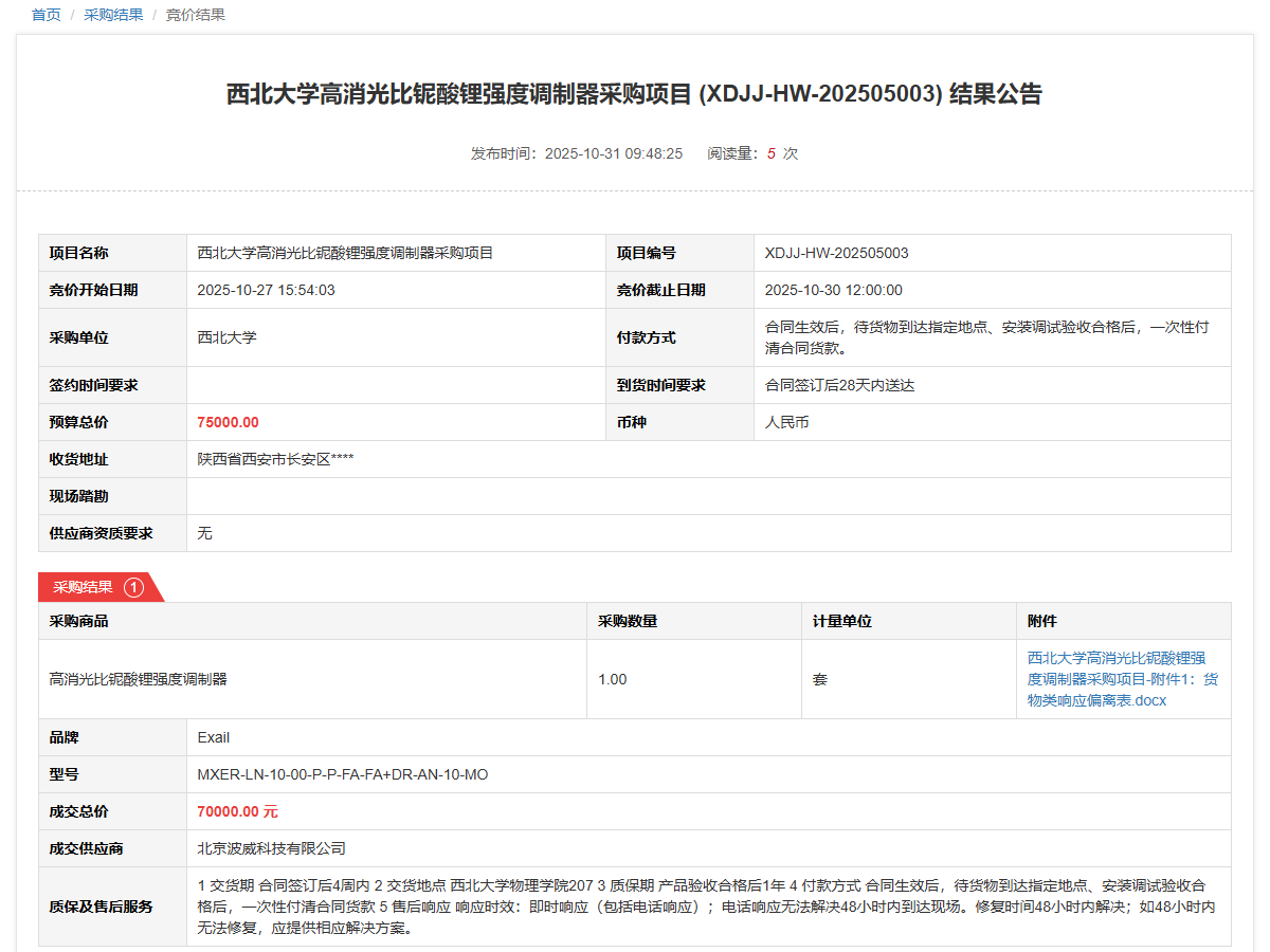 必赢3003no1线路检测中心高消光比铌酸锂强度调制器采购项目(XDJJ-HW-202505003)竞价结果公告