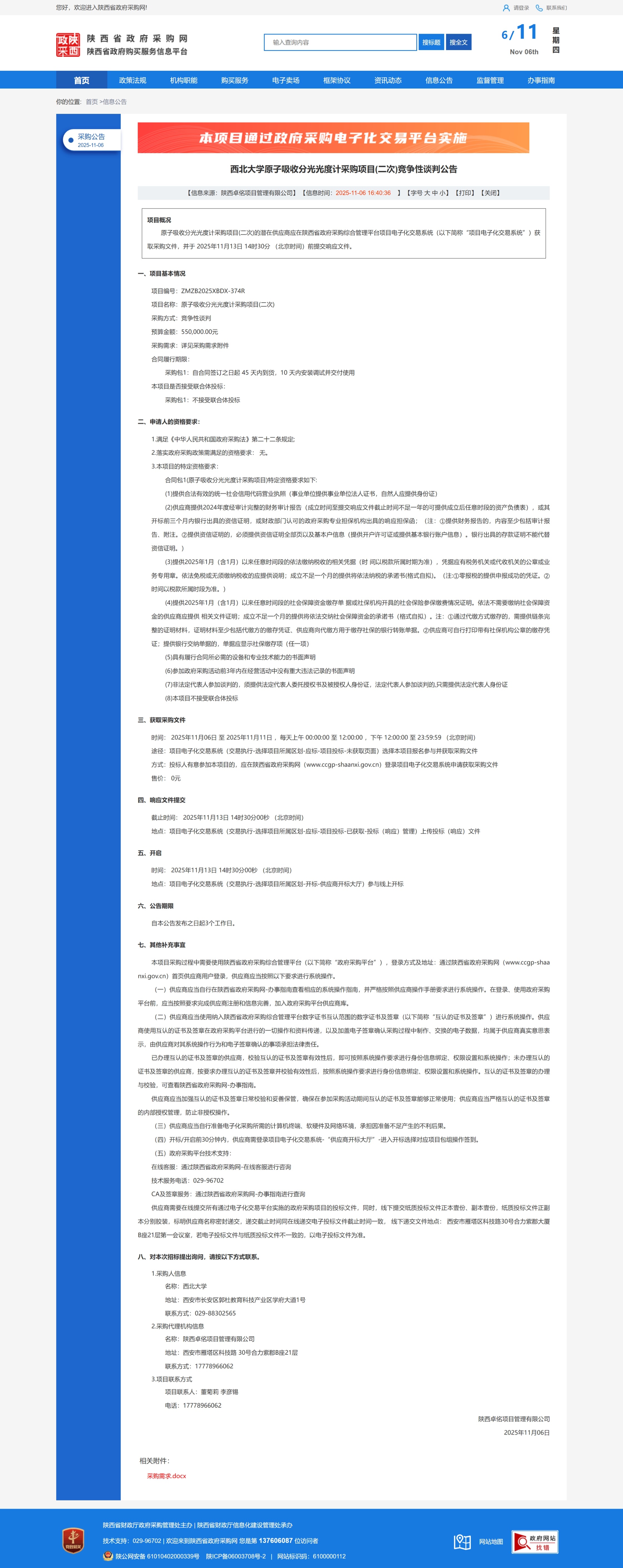必赢3003no1线路检测中心原子吸收分光光度计采购项目(二次)竞争性谈判公告 作者: 编辑:国有资产管理处 时间:2025-11-06 原公告链接:https://www.ccgp-shaanxi.gov.cn/freecms/site/shaanxi/ggxx/info/2025/8a69c6c799f7737f019a583d8959716b.html?noticeType=001013¬iceId=79136a9c-baee-11f0-8063-08c0eb20c666