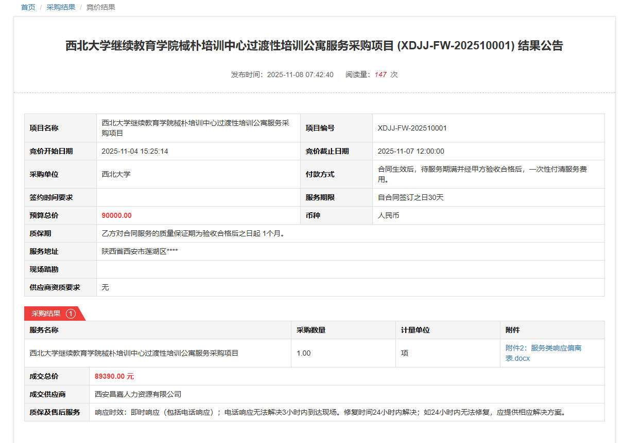 必赢3003no1线路检测中心继续教育学院棫朴培训中心过渡性培训公寓服务采购项目(XDJJ-FW-202510001)竞价结果公告