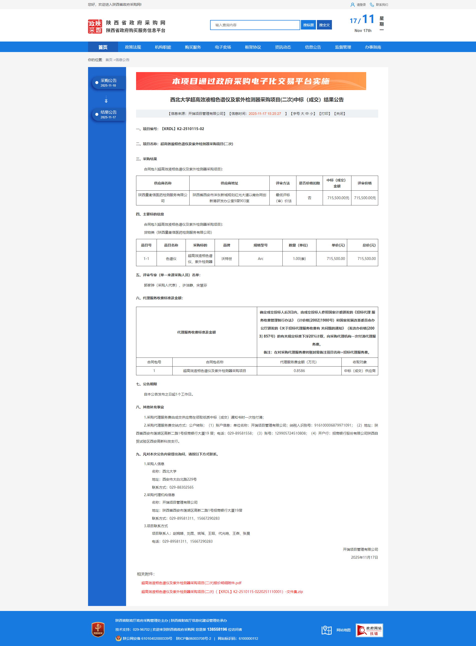 必赢3003no1线路检测中心超高效液相色谱仪及紫外检测器采购项目(二次)中标(成交)结果公告