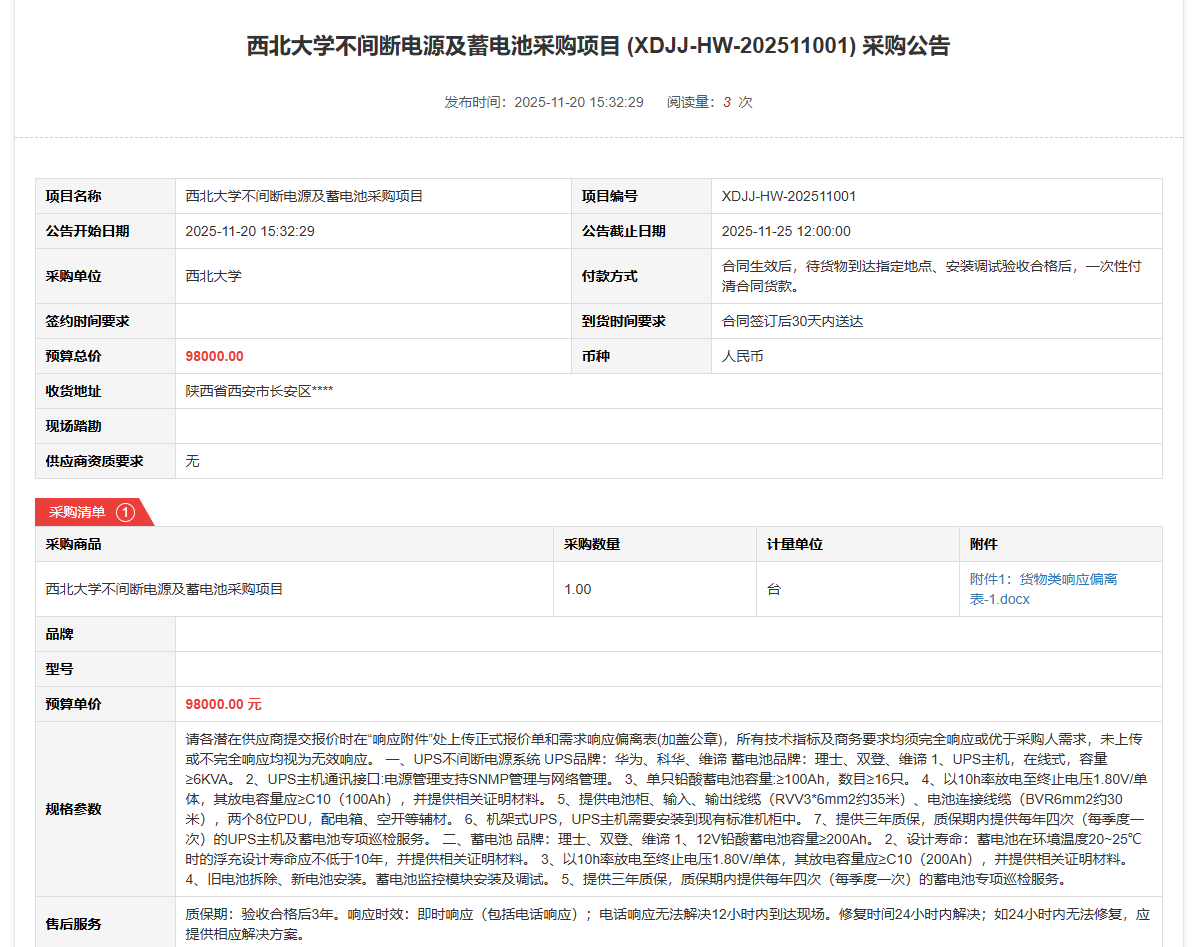 必赢3003no1线路检测中心不间断电源及蓄电池采购项目(XDJJ-HW-202511001)竞价采购公告
