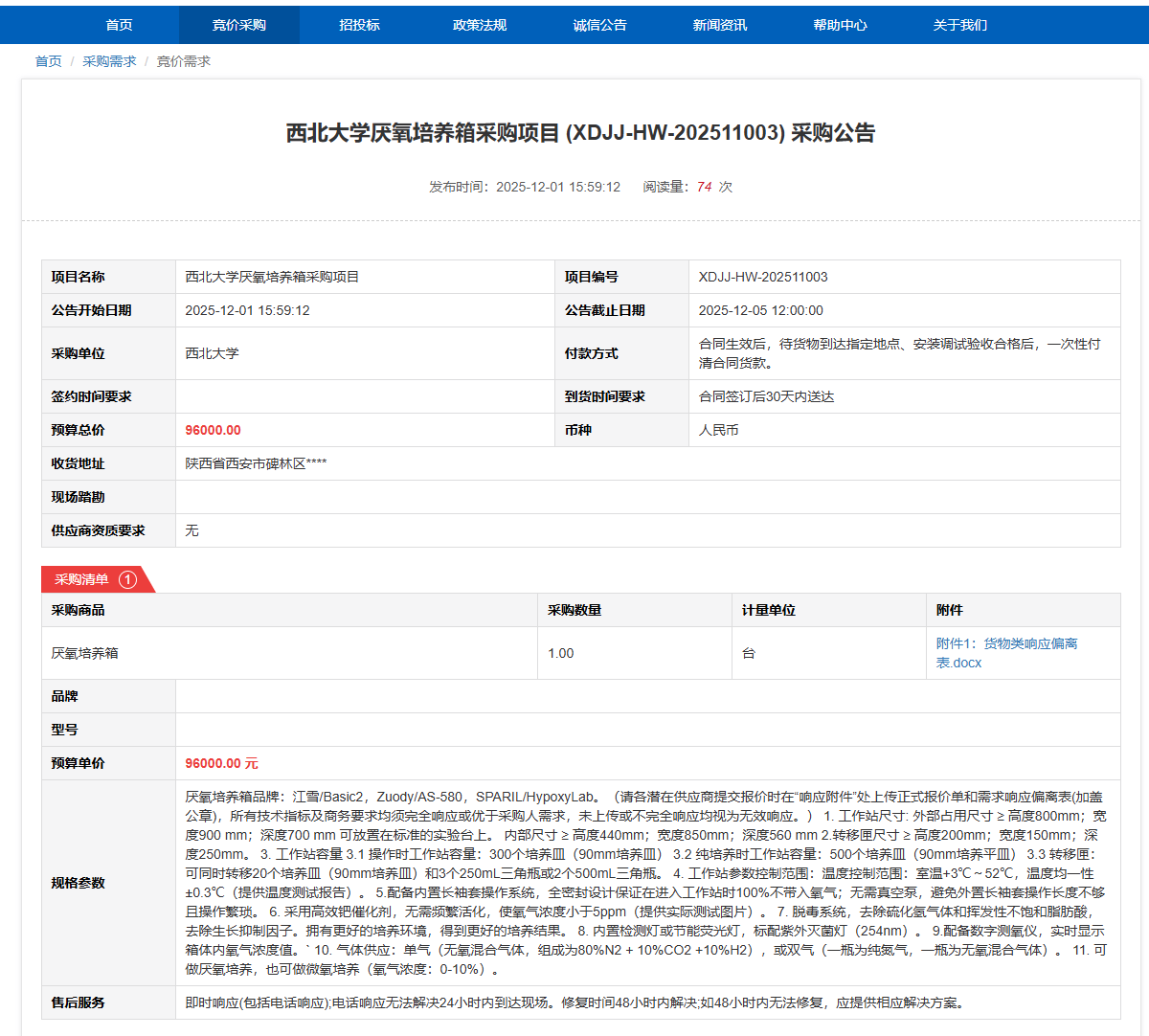 必赢3003no1线路检测中心厌氧培养箱采购项目(XDJJ-HW-202511003)竞价采购公告