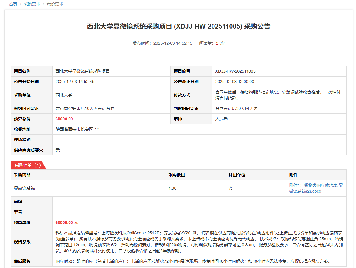 必赢3003no1线路检测中心显微镜系统采购项目(XDJJ-HW-202511005)竞价采购公告
