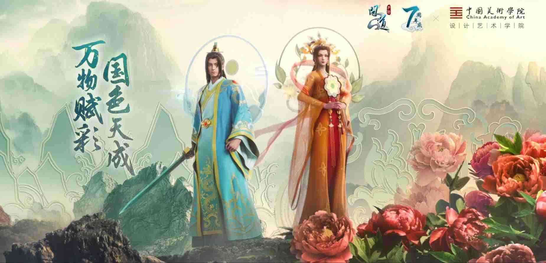 2023年4月,,《问道手游》联动中国美术学院,,,在游戏中融合了中国历史上不同时期的文化元素,,,打造了“山河万象”与“凤鸣九霄”的国风时装。。在色彩配置方面,,创作团队基于对游戏角色特性的分析提取相应的文化内涵,,从每一种色彩的色相、、、、指代事物和情感出发对应角色属性,,,选定服装的色彩搭配。。。在纹样设计方面,,,创作团队结合游戏角色自身特殊的造型比例和形态,,,在实际的纹样设计中进行了游戏语境下的活化演绎。。。。男性角色集中使用了如蟒纹、、海水江崖纹、、如意纹和云气纹等传统纹样元素,,,,女性角色则吸纳了凤凰纹、、牡丹纹、、、卷草缠枝纹等元素,,,组成以“双凤牡丹纹样”“缠枝牡丹纹”“金玉凤冠头饰”为主要纹样的游戏角色装饰图案系统。。