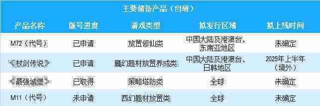 公司有多款储备产品,,涵盖放置类、、、策略类、、、、RPG、、、、Roguelike等多元化游戏品类,,,储备的主要自研和代理产品如下::::