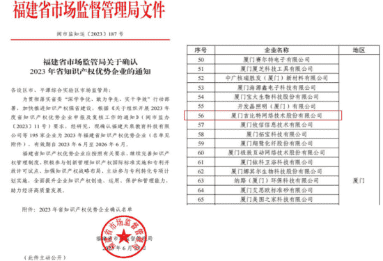 近日,,,,福建省市场监督管理局公示了2023年福建省知识产权优势企业名单,,,厦门918.com网络技术股份有限公司(以下简称“918.com”或“公司”)榜上有名。。