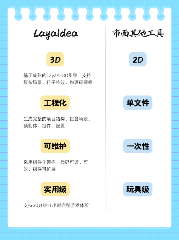 基于LayaAir引擎,,LayaIdea构建了一套完整的工业级AIGC开发流程,,,,实现了从策划文档到完整3D游戏项目的自动化生成,,与市面现有AIGC工具在技术能力、、实用性上形成显著差异,,,具体对比如下::::